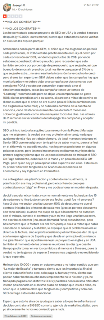 Esto es un tema más complicado, pues a día de hoy BigSEO trabaja únicamente con clientes con un gran capital, por lo que es difícil encontrar reseñas negativas de clientes pequeños que hayan trabajado con ellos. Aunque ahora Romuald Fons va a abrir una nueva línea de negocio colaborando con Mr.Bogart para atender a pymes. Volviendo al tema, hemos estado buscando reviews de BigSEO